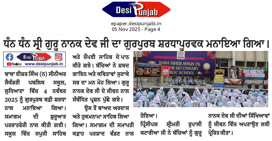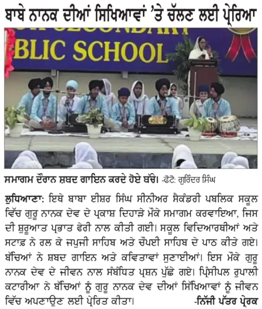 Baba Isher Singh (Nanaksar) Senior Secondary Public School, B.R.S. Nagar, Ludhiana was established in 1987 to commemorate the memory of His Holiness Saint Baba Isher Singh Ji, under the guidance and active participation of His Holiness Baba Kundan Singh Ji at Nanaksar.